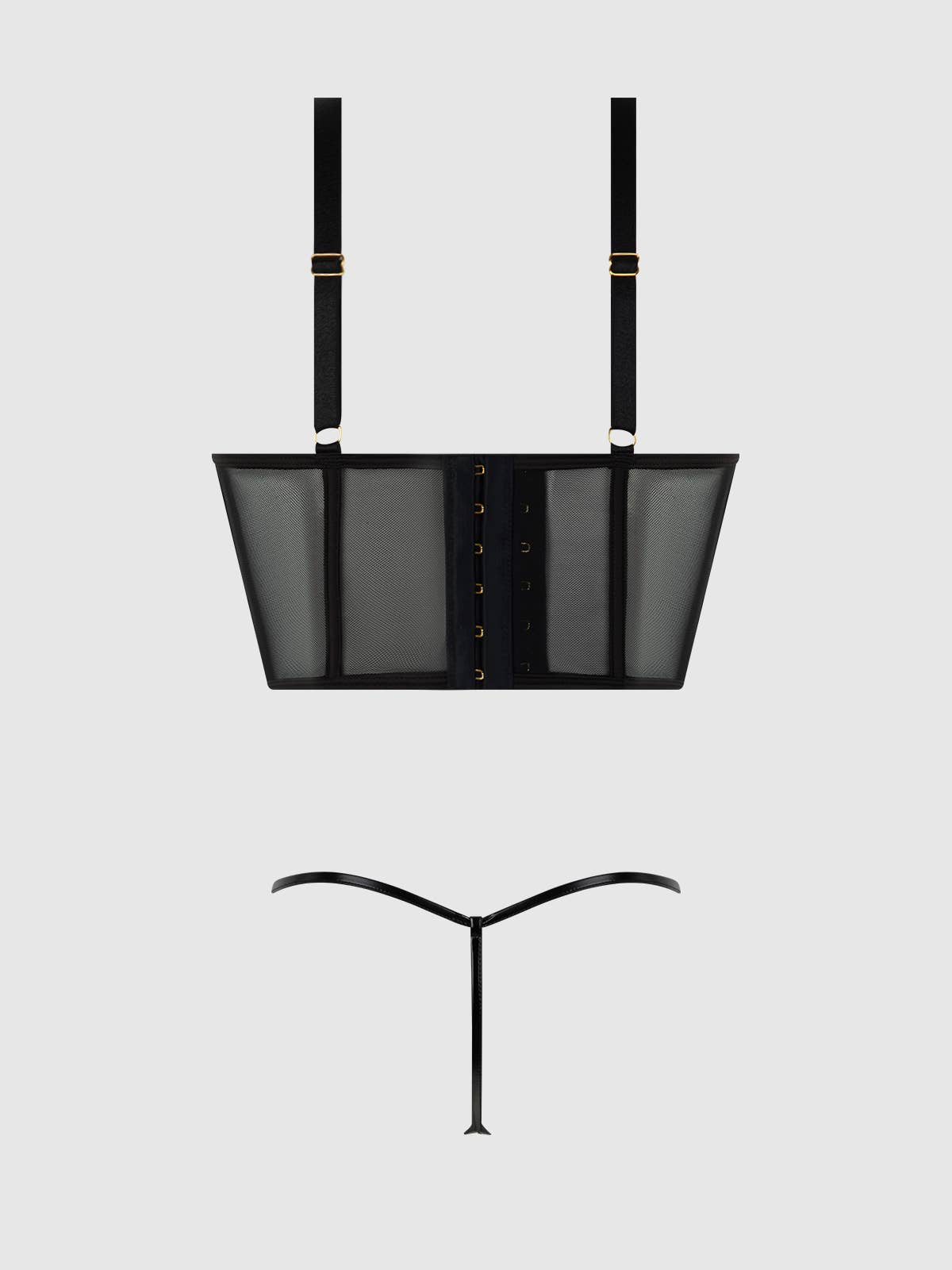 Dare to steal the spotlight with the Eve Lace & Chain Bustier & G-String Set. This bold combination fuses dark elegance with a touch of mischief. Crafted in fine stretch mesh, lace panels add intrigue, while wired half cups with scalloped edges and glimmering chains drape sensually over your body. Paired with the matching G-string, this set will leave them breathless.